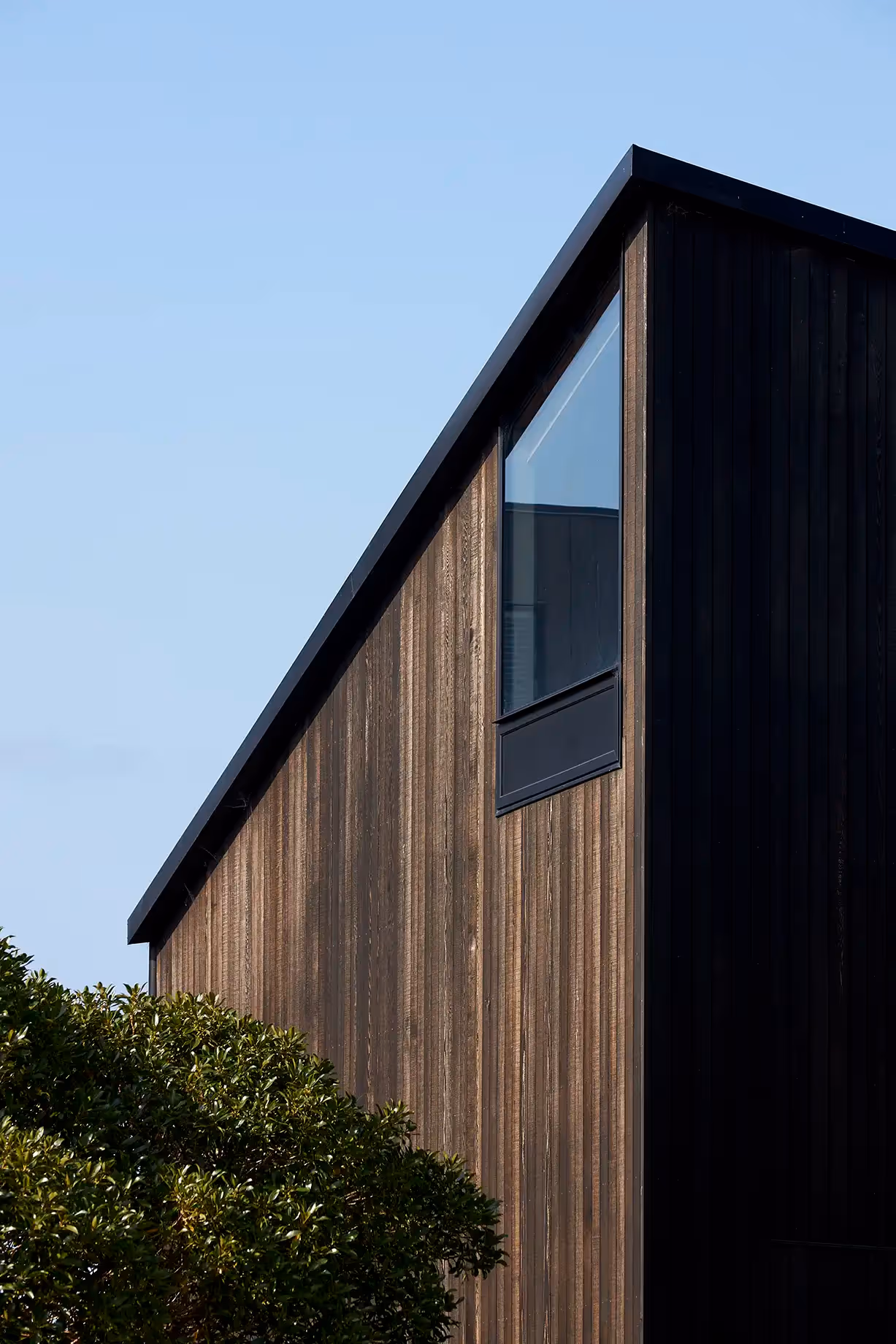 The dynamic of the external geometry is made known throughout the interior generating both the lofty expansive breathing space and tapering back down to the low, snug window seat. Passing through the weathering exterior, the angular form approached gives way to warm timber linings. A diagonal path bi-sects the plan and presents the stairwell, leading guests up to the elevated living space. From this raised position occupants sit and observe the wind-swept dunes.