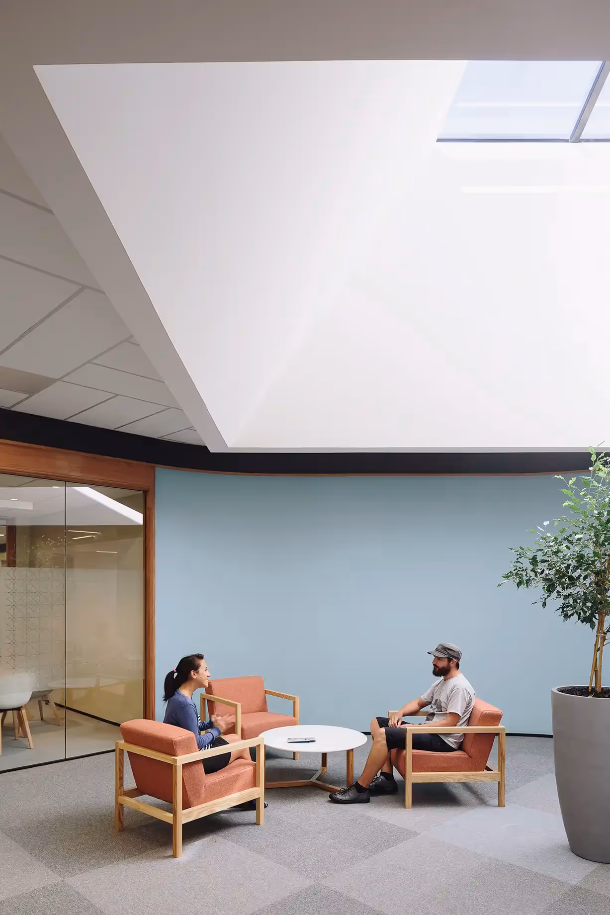 A generous pedestrian approach and curving timber-clad walls either side of the entranceway form an encouraging welcome to this new workspace. Inside, it  becomes clear that circulation, control of light and the needs of users have  been the architect’s primary considerations. The central atrium successfully  links old with new, while bringing natural light right into the heart of the  deep floor plate. The staffroom, democratically positioned to capture the best views through the trees of Seddon Park, is a moment of delight. The  office has an internal street system with central meeting rooms and break-out  spaces dividing the large office complex into zones which are generously proportioned and complemented by timber accents and a cheerful colour palette.