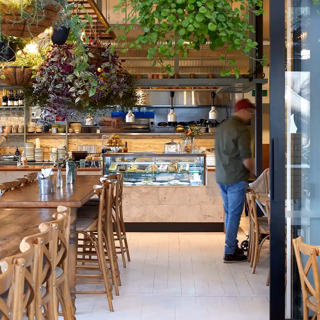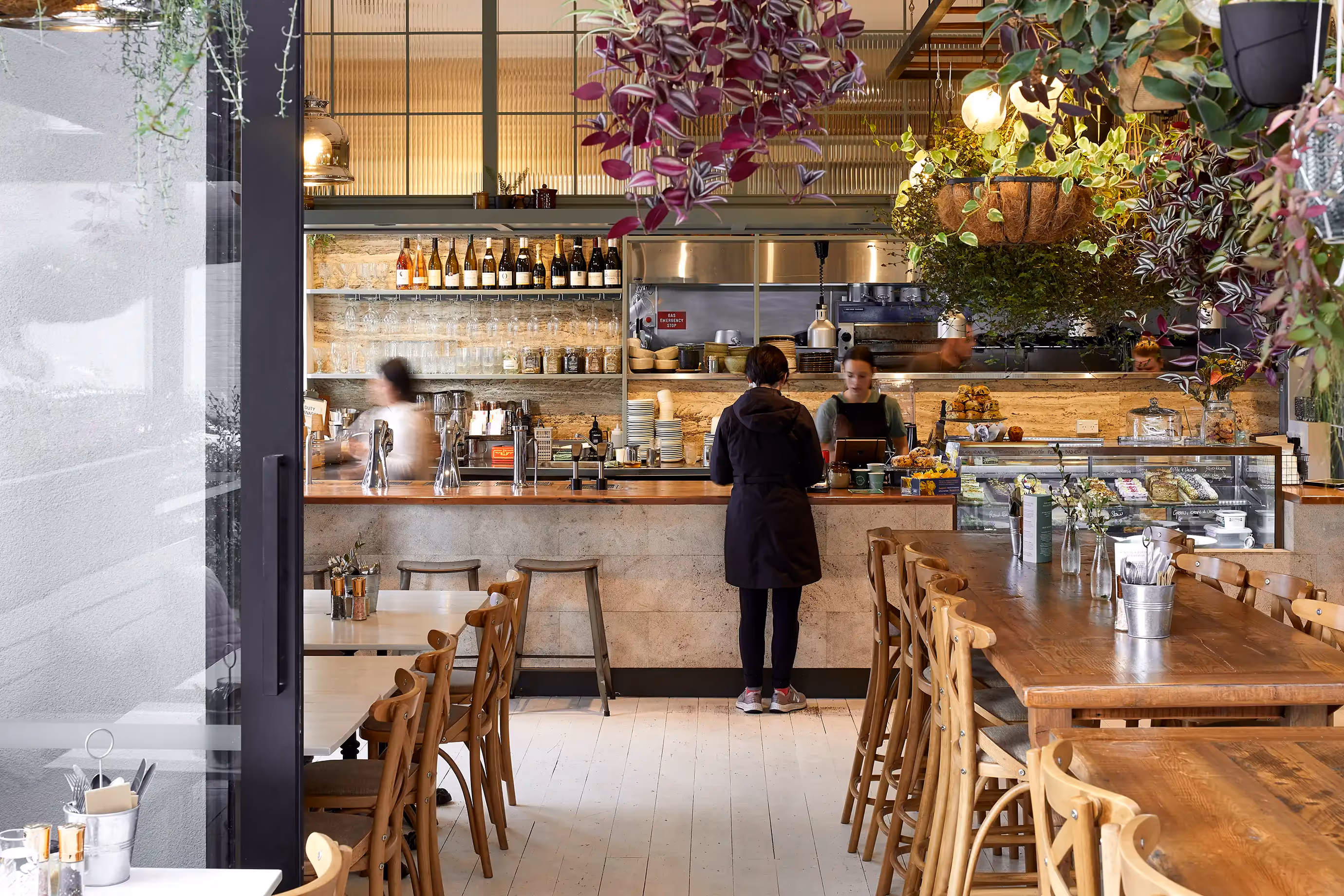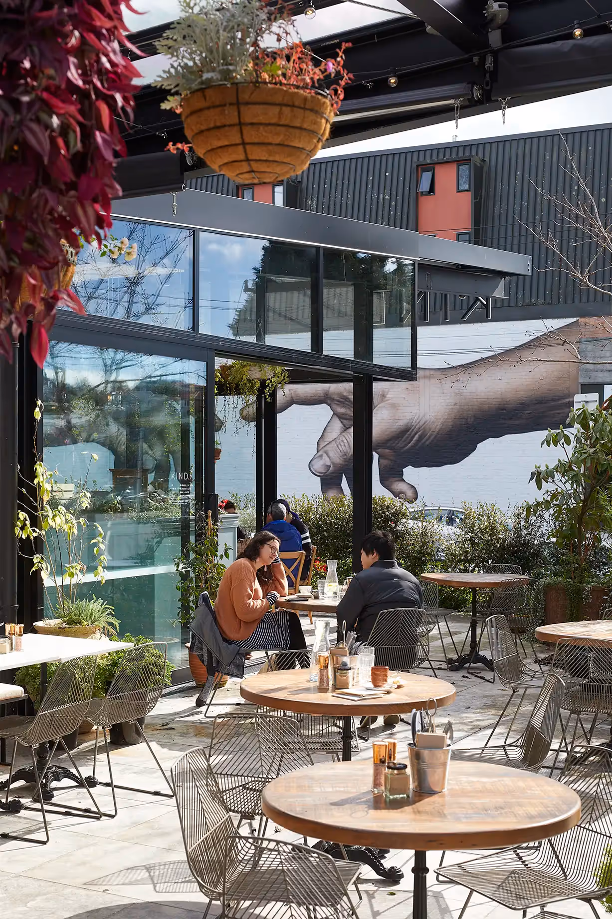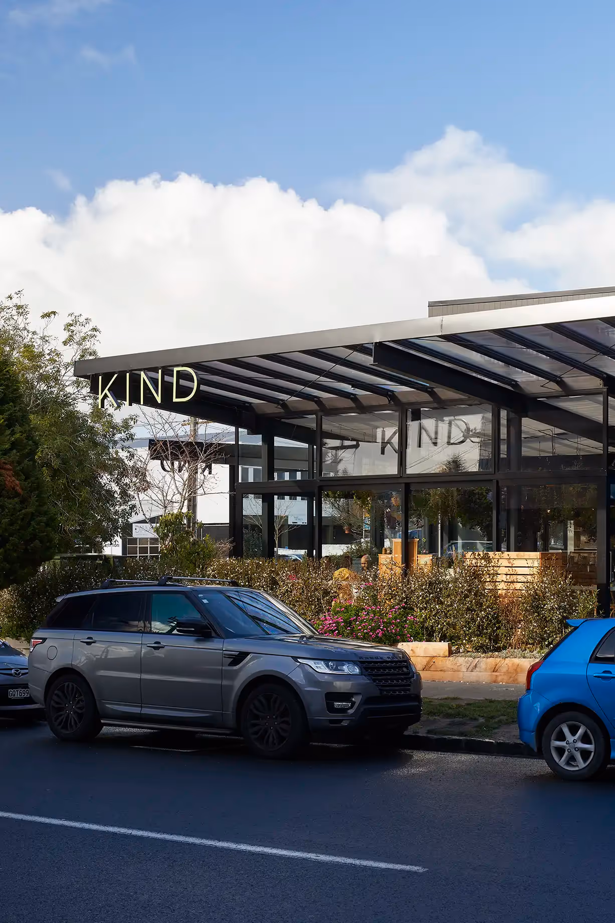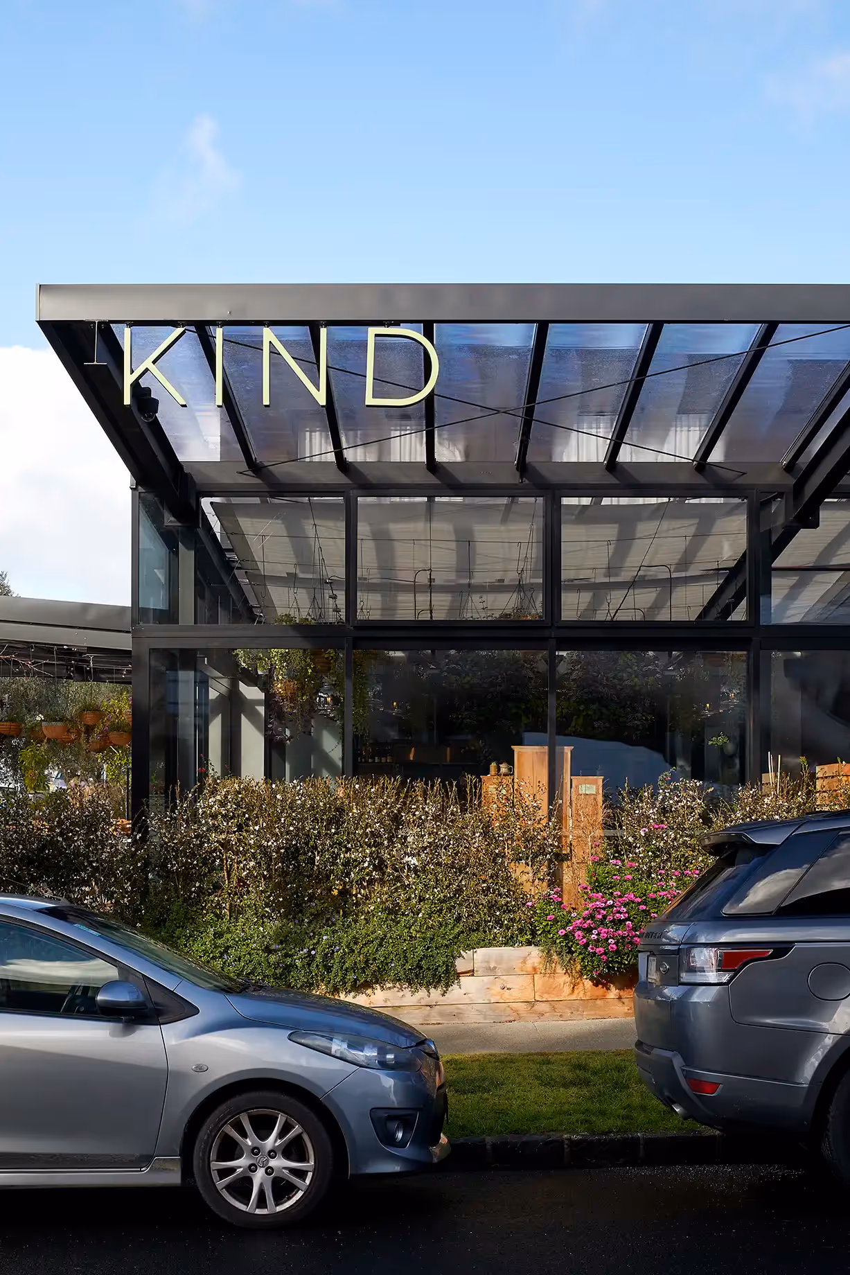 Kind Café sits on a busy corner site in what had been a rather grim area of Morningside. Lush greenery and hanging baskets add vibrant splashes of colour to a grey, semi-industrial neighbourhood and provide dappled shade under the greenhouse roof. The junction of inside and outside spaces is blurred and, wherever you sit, the café is an engaging and delightful space to inhabit.  There is a commendable commitment to sustainability, with community  composting and the conversion of the local disused bowling club to a produce garden. In sum, the café is a vibrant addition to a previously neglected  suburb.