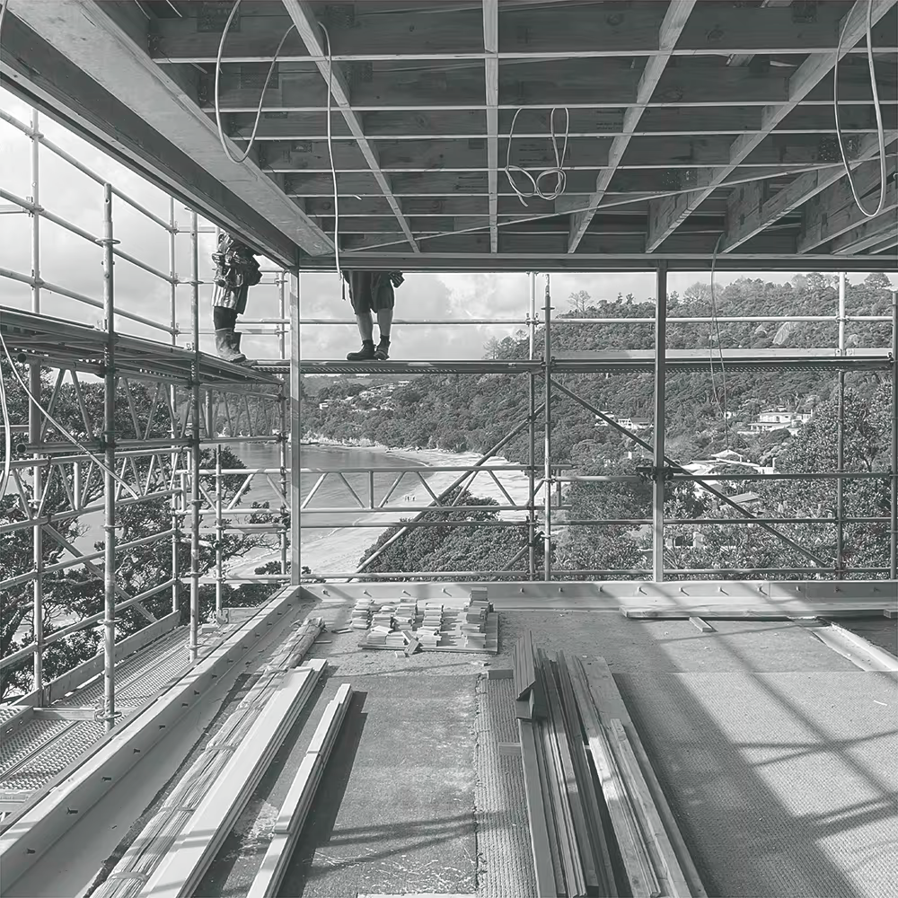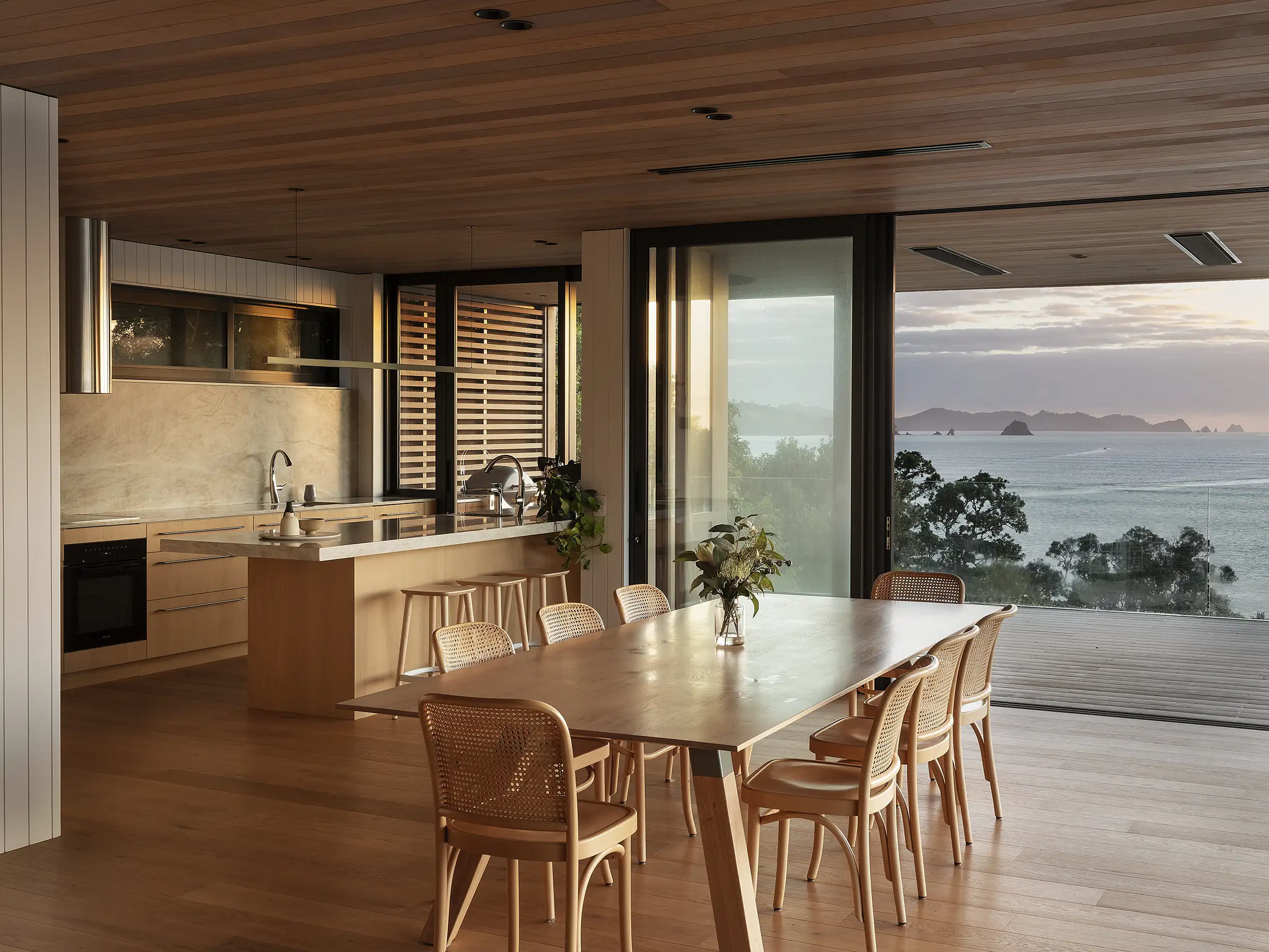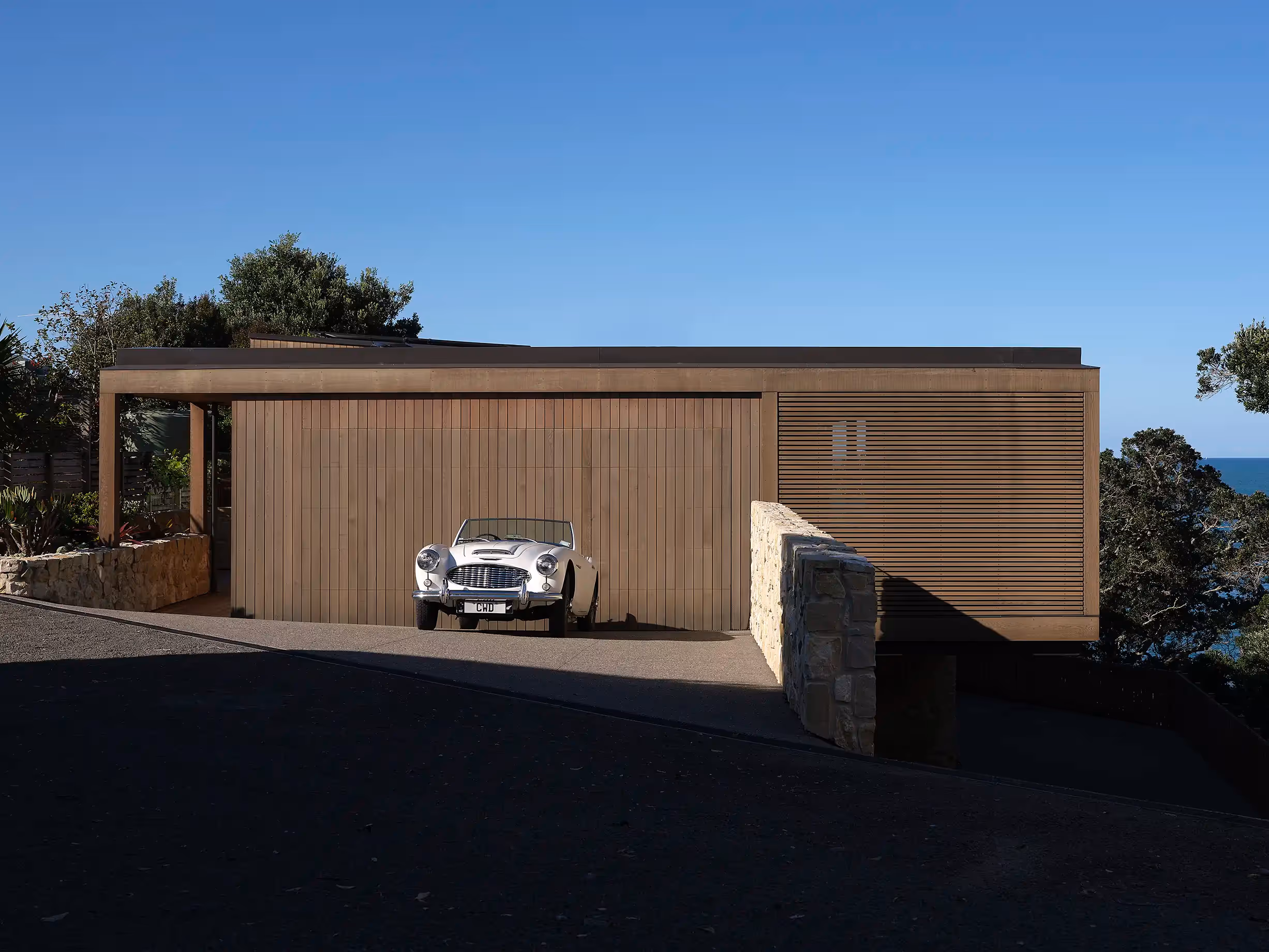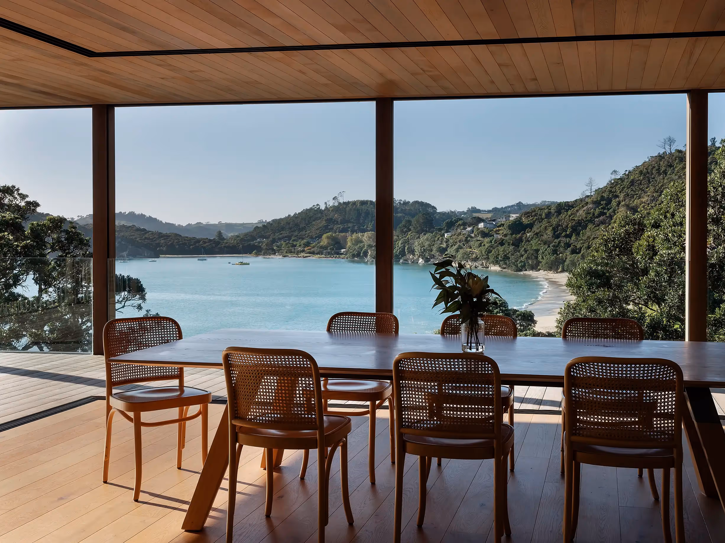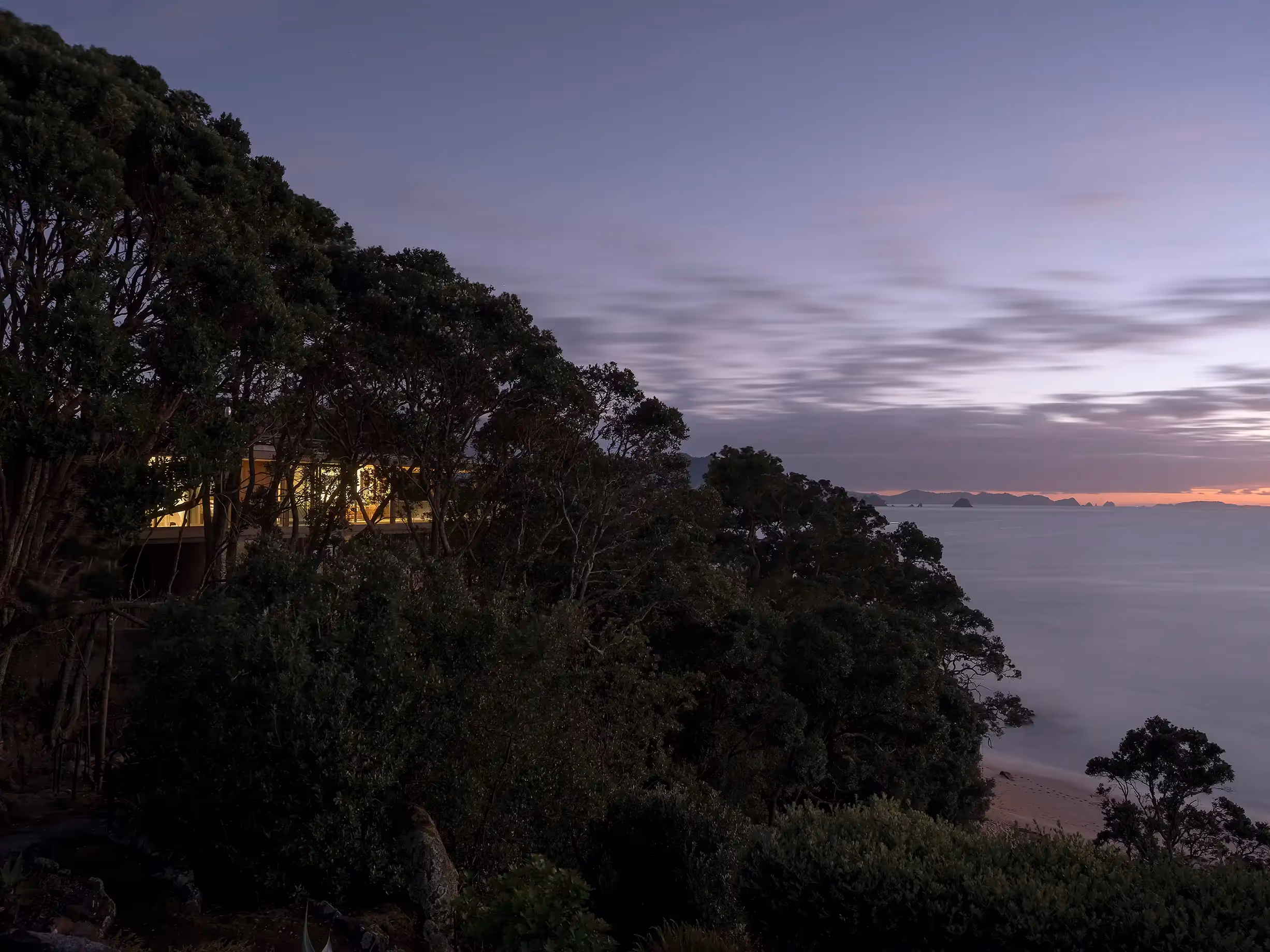 This multi-generational holiday home is a considered response to the needs of its inhabitants and the spectacular site overlooking Maramaratotara and Mercury Bays. The challenge of the site’s steep terrain, established pōhutukawa and native vegetation, called for sensitivity during the design and construction process. The result is a floating cedar box atop a stone base embedded into the cliff face. It provides varying levels of enclosure, exposure to the natural elements and – importantly – strong connection to its beachside location.
