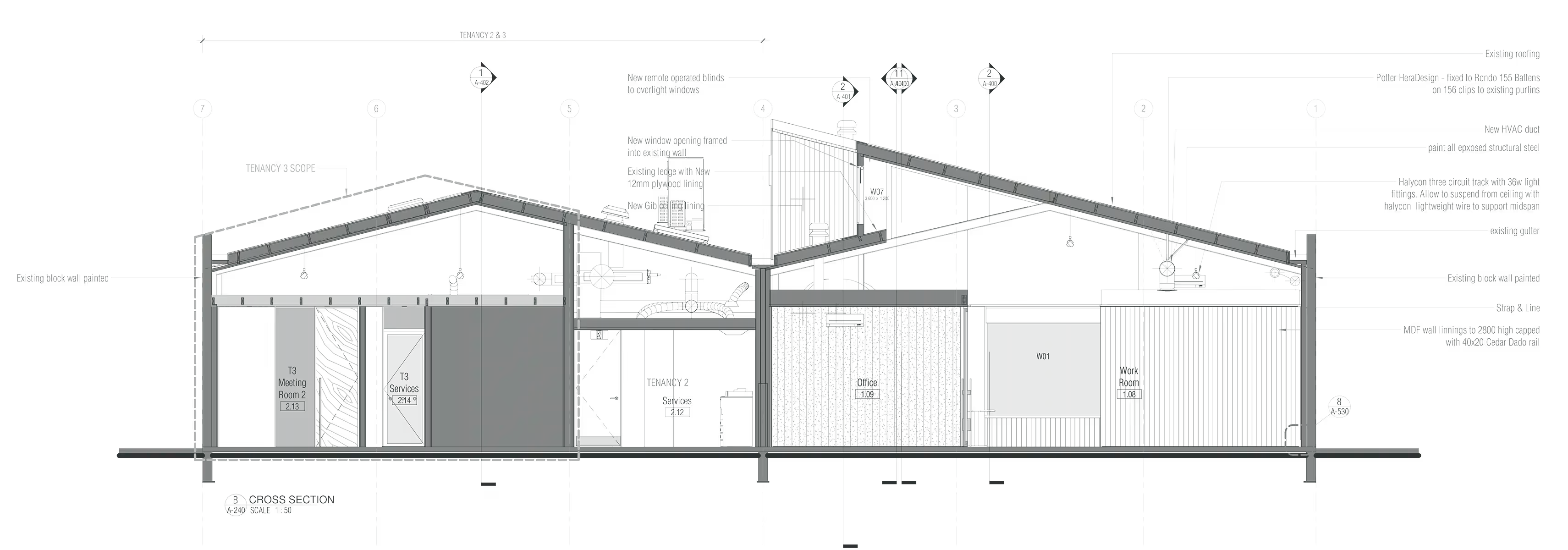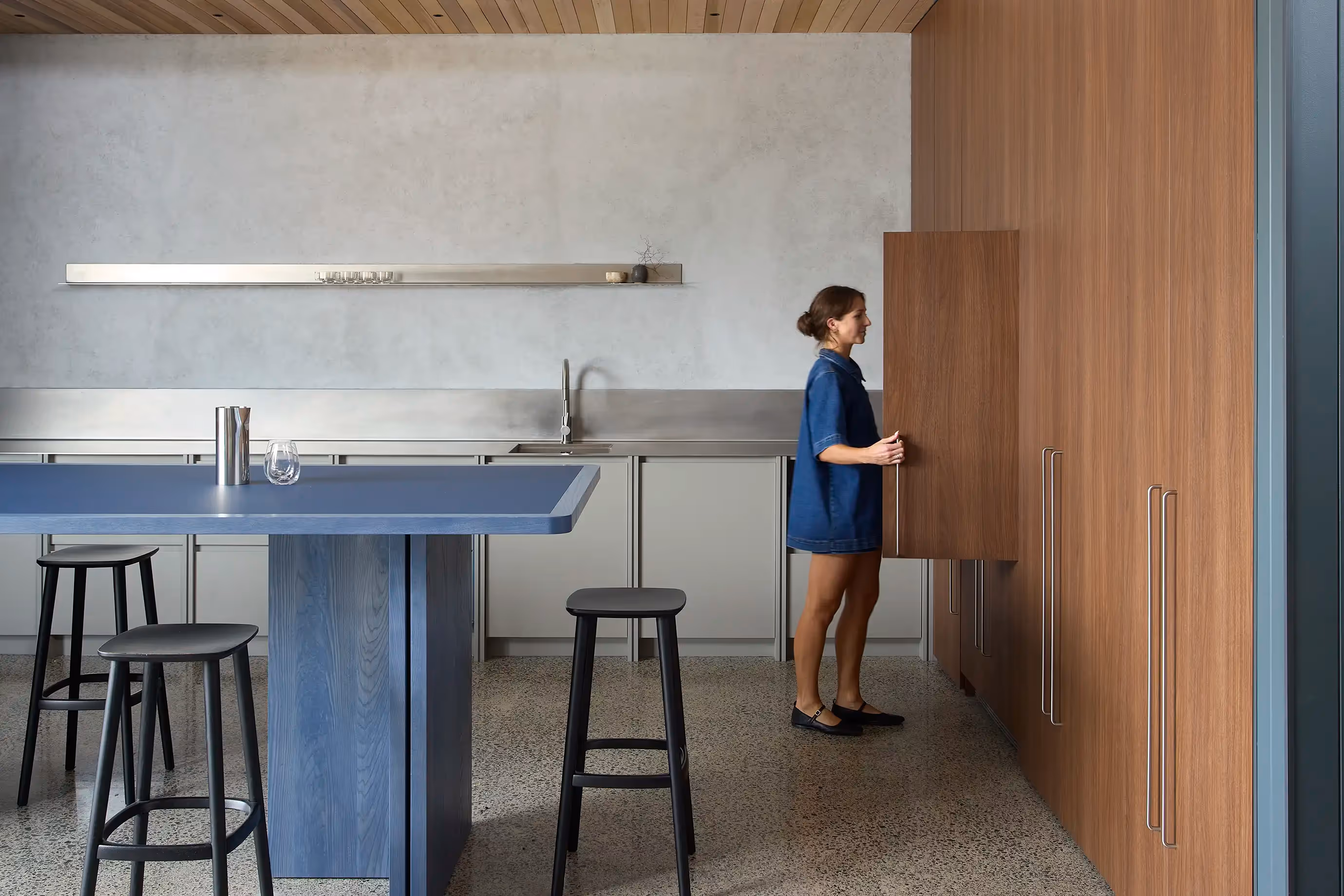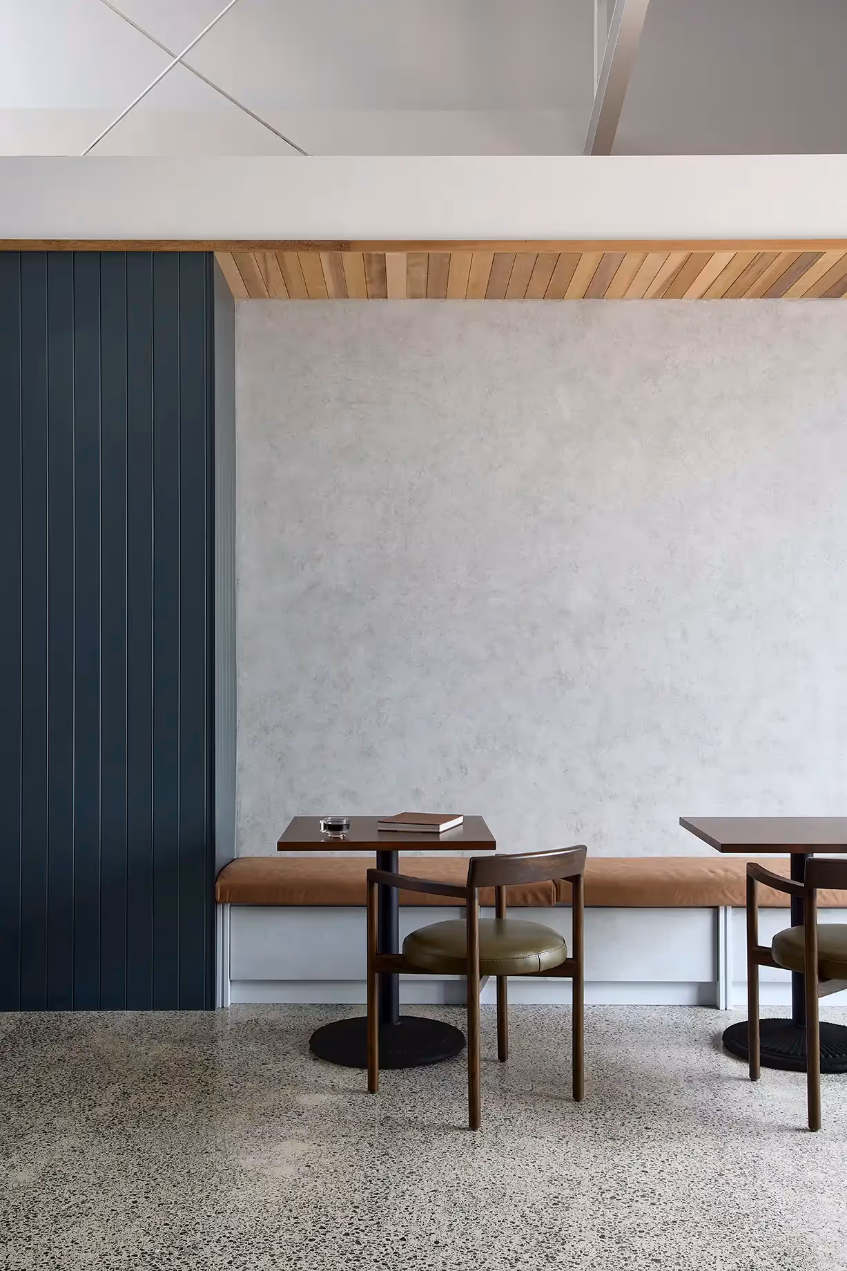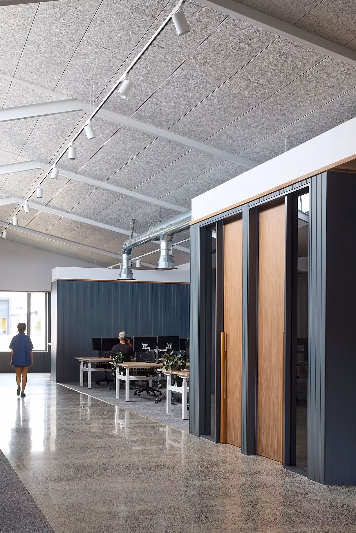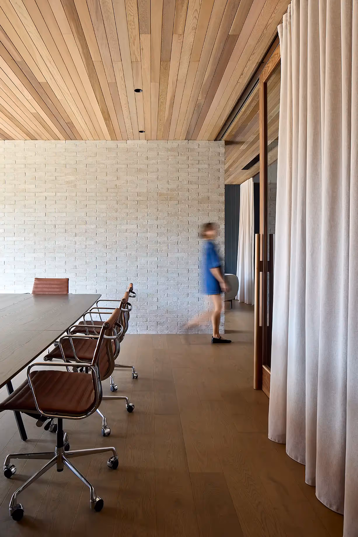 The interior design focuses on creating a space that protects its inhabitants by offering a quiet environment with lofty volumes and natural light. Warm timber tones, calming hues of blue, and soft drapery add character to a streetscape otherwise dominated by hard surfaces. The existing high-level windows and sawtooth roof, retained from the original design, acknowledge the building's heritage providing soft natural illumination to the interior spaces.